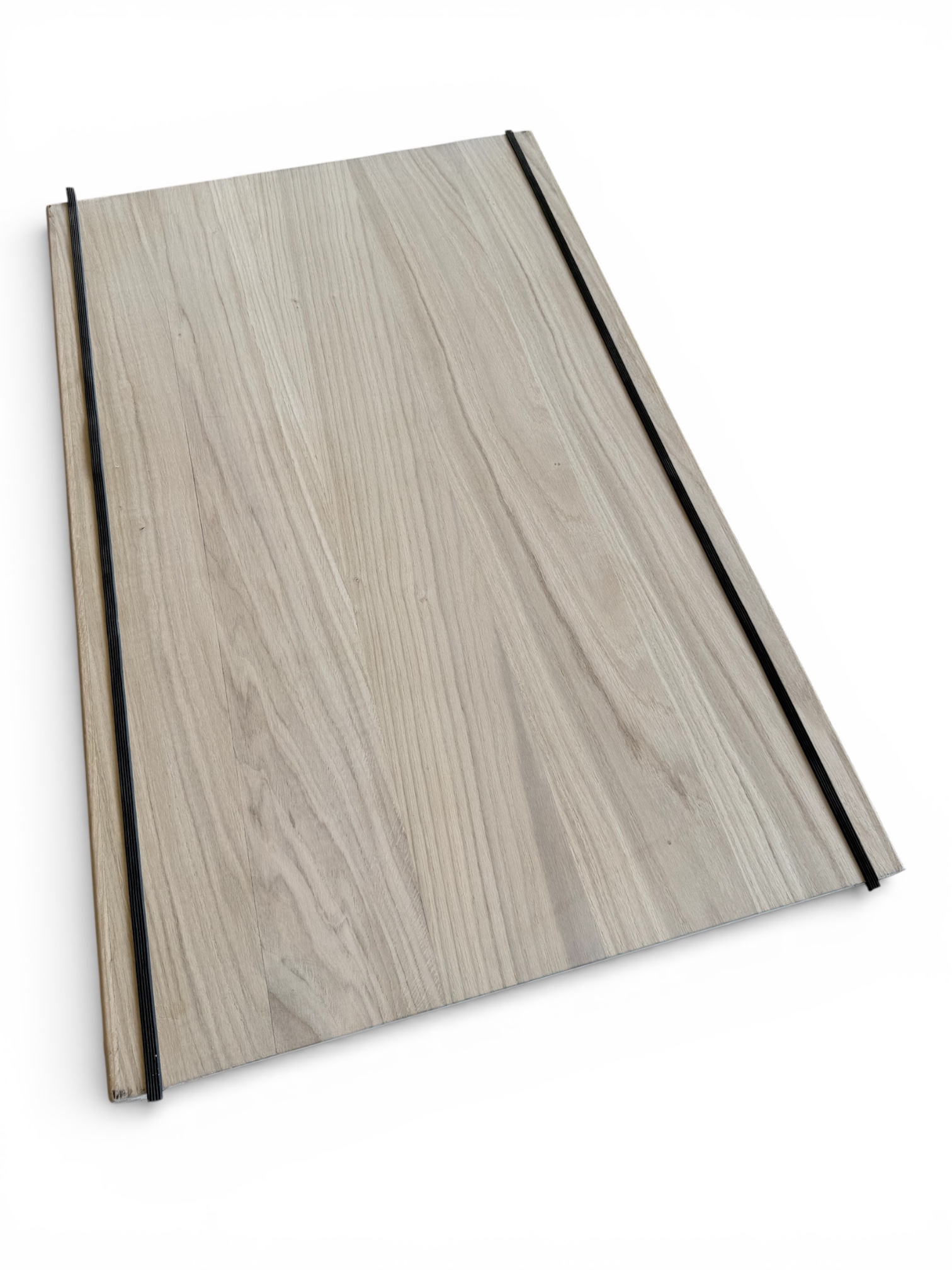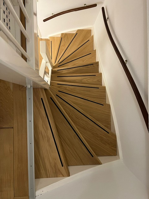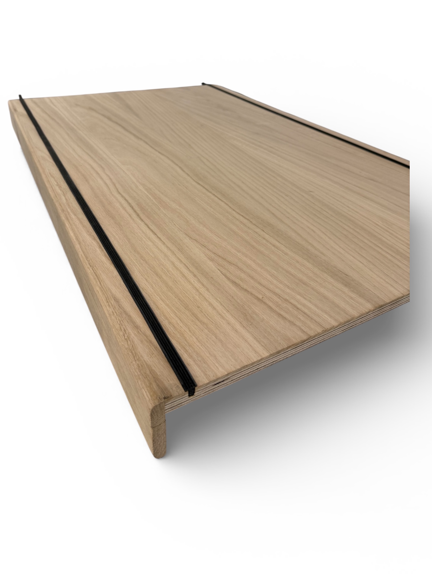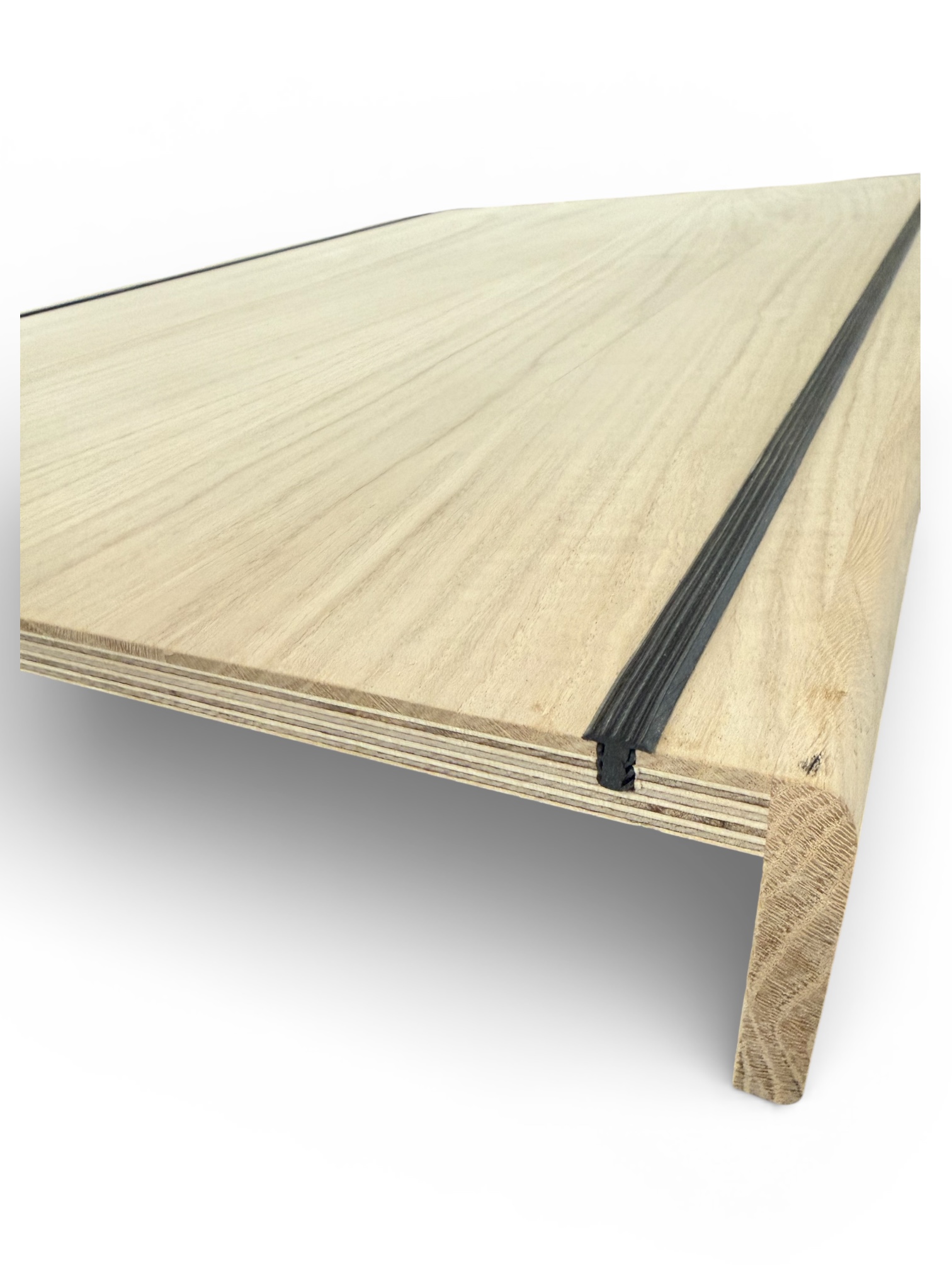 Het paneel bedoelt voor traprenovatie is 644 mm breed (buitenmaat), de afmeting tussen de trapneuzen (binnenmaat) is 620 mm. Het bestaat uit twee lagen, de 12mm multiplex onderlaag is opgebouwd uit meerdere kruislings verlijmde lagen. De toplaag is van 4mm massief eiken. Dit wordt stevig op het multiplex verlijmd, zodat de hele plank vrijwel niet meer ‘werkt’ – krimpt of uitzet – onder invloed van temperatuur of vocht. De massieve neus is 12 mm dik. De neus is aan de zichtzijde 72 mm hoog.