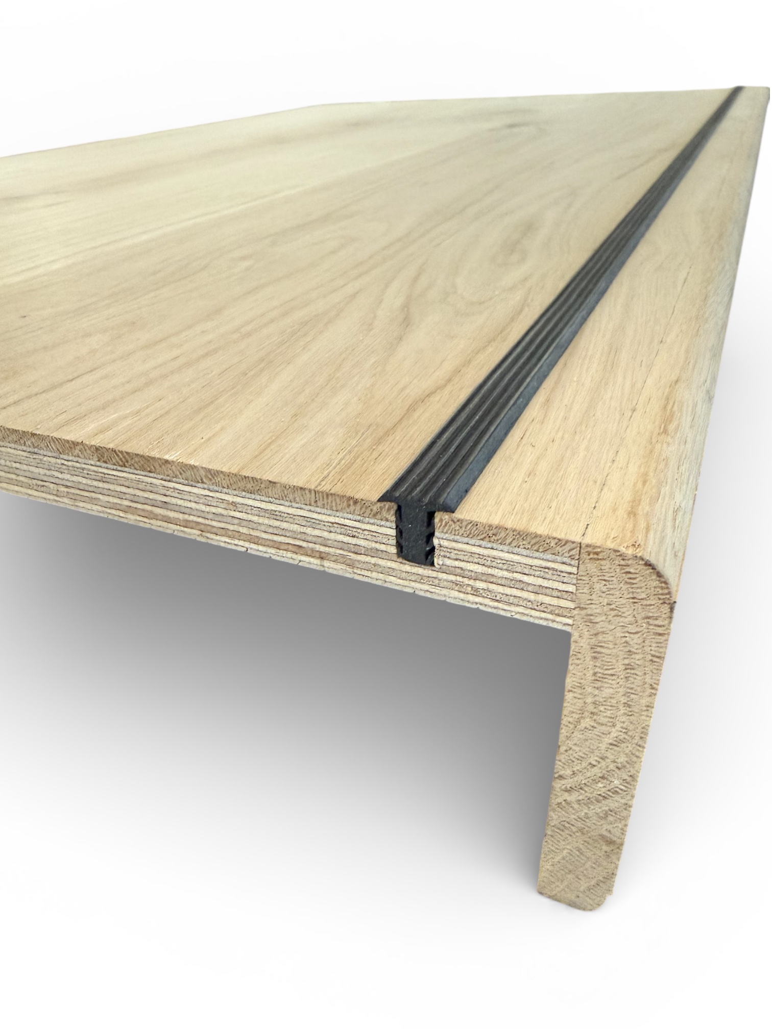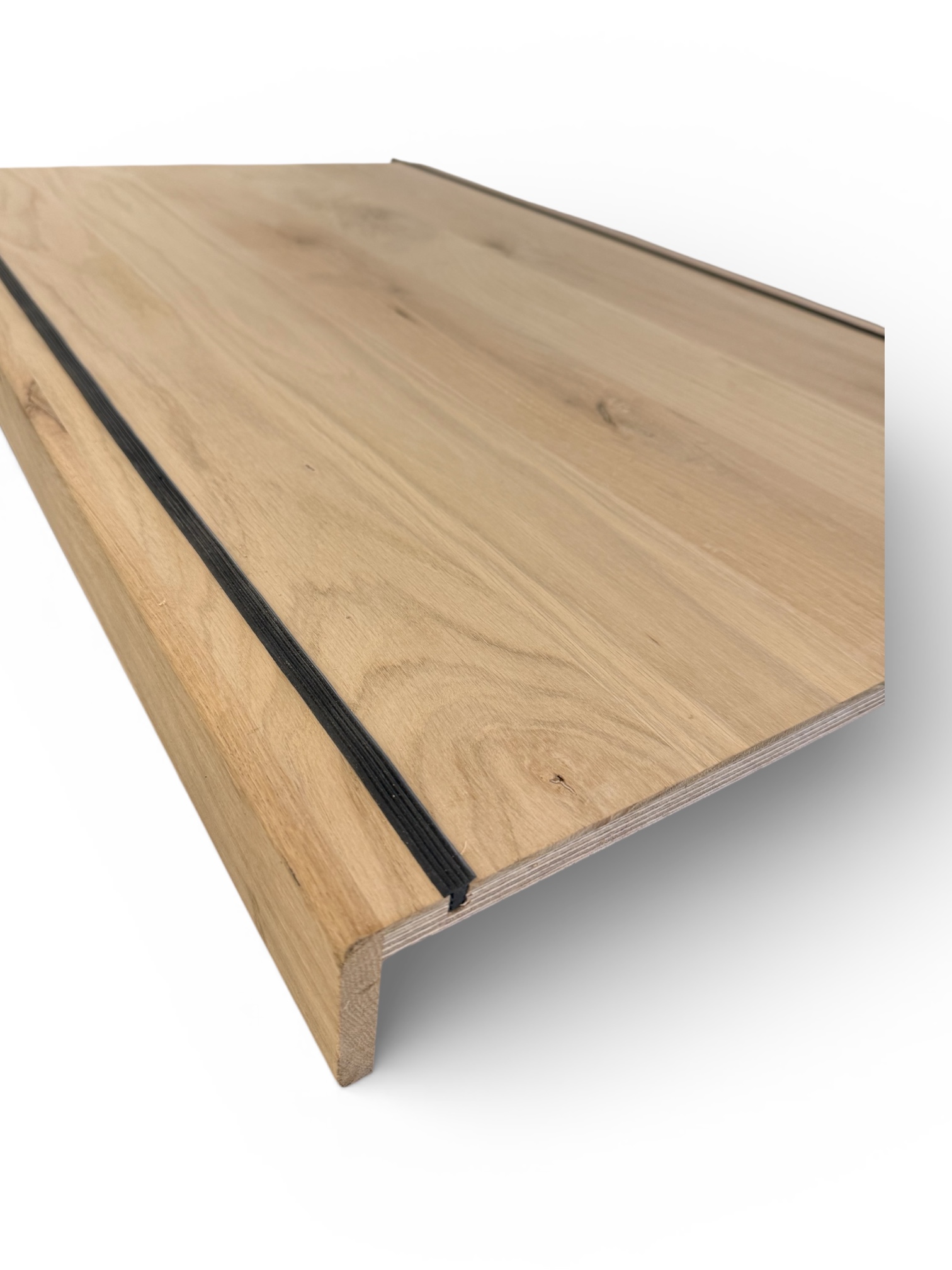 Het paneel bedoelt voor traprenovatie is 644 mm breed (buitenmaat), de afmeting tussen de trapneuzen is 620 mm. en hier kunnen twee trapdelen uit worden gehaald. Het bestaat uit twee lagen, de 12mm multiplex onderlaag is opgebouwd uit meerdere kruislings verlijmde lagen. De toplaag is van 4mm massief eiken. Dit wordt stevig op het multiplex verlijmd, zodat de hele plank vrijwel niet meer ‘werkt’ – krimpt of uitzet – onder invloed van temperatuur of vocht. De massieve neus is 12 mm dik. De neus is aan de zichtzijde 72 mm hoog.