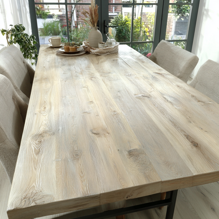 Onze tafelbladen bestaan uit een stabiele multiplex basis met een toplaag van echt eikenfineer van circa 4 mm dik. De randen zijn afgewerkt met massief eikenhout, zodat het blad eruitziet als een volledig massief exemplaar, maar vormvast en lichter in gewicht blijft.