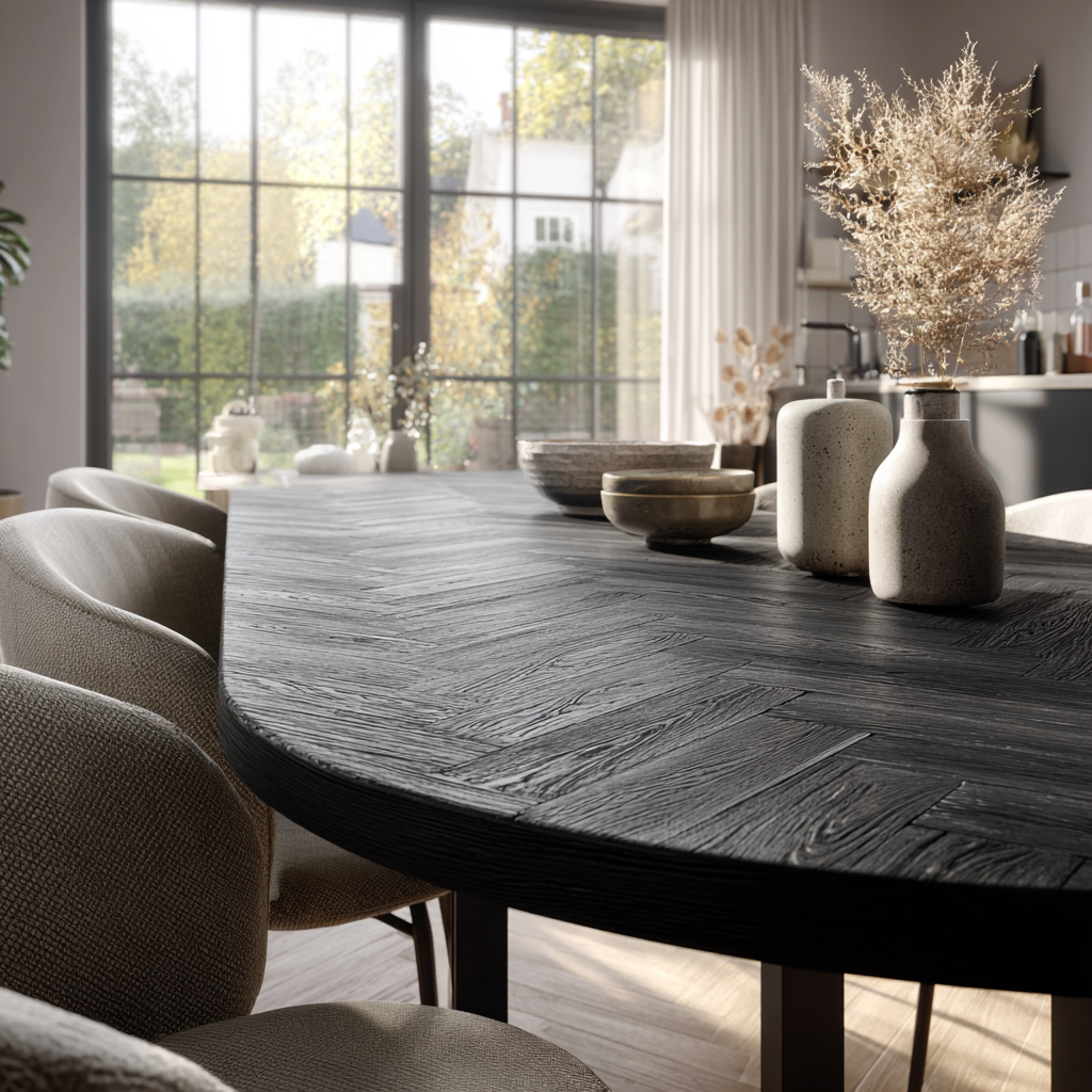 Een ovaal eiken tafelblad is bij uitstek geschikt voor ruimtes waarin u een gevoel van openheid en balans wilt creëren. Door de afgeronde vorm heeft het blad geen scherpe hoeken, waardoor de tafel optisch minder ruimte inneemt dan een rechthoekig model. Dit maakt het een uitstekende keuze voor kleinere eetkamers of woonkeukens, waar u optimaal gebruik wilt maken van de beschikbare ruimte zonder aan zitplaatsen in te leveren. De vloeiende lijnen zorgen bovendien voor een natuurlijke doorloop rondom de tafel.